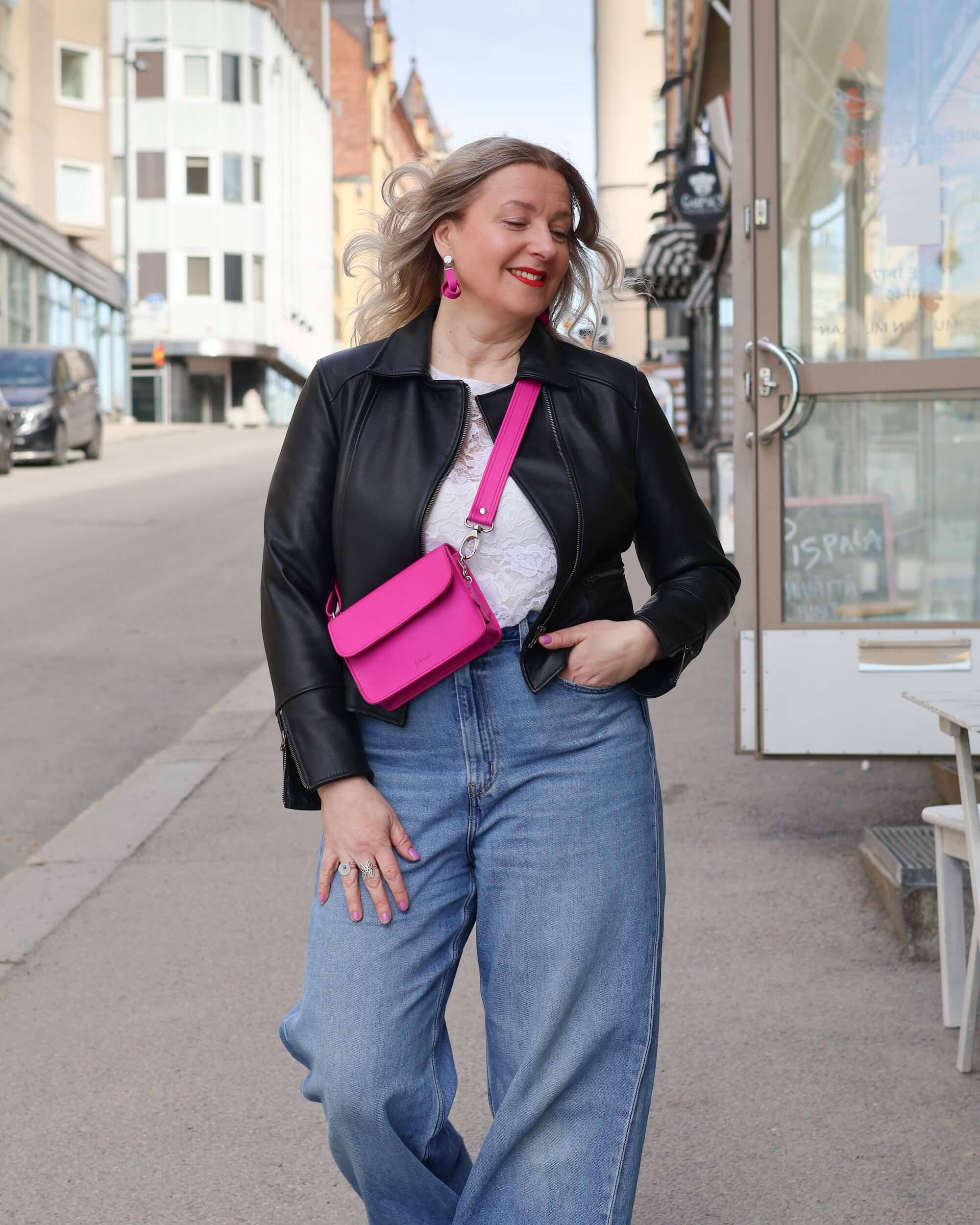 Vuonna 2023 valikoimamme laajeni, ja sain suunniteltua kauan haaveilemani kotimaisen nahkatakin. Kiedo Ainoa nahkatakki valmistetaan kotimaisesta peurannahasta, ja se on loppuun saakka hiottu viimeistä yksityskohtaa myöden. Takin silkinpehmeä nahka yhdistyy herkän roosaan vuorikankaaseen, jossa hyödynnetään kotimaisen feelK brändin kupro/ecovero viskoosia. Takkia on mahdollista kustomoida, sillä teemme takin tilauksesta - näin asiakas saa mittoihinsa sopivan nahkatakin ja vältämme arvokkaiden materiaalien harkitsemattoman käytön.
