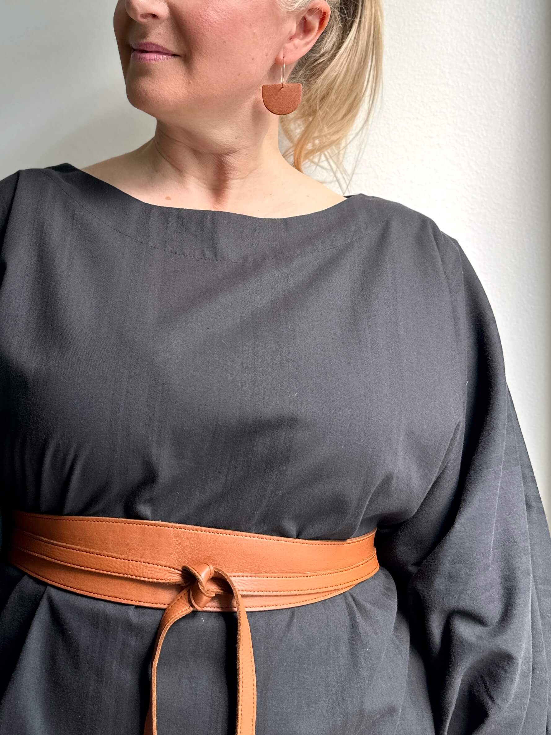 Materiaali: korvakorujen nahka on teollisuuden ylijäämänahkaa/ Kiedo vöiden leikkuun ylijäämänahkaa. Metalliosat kirurgin terästä, kultaisen väriset aidolla 18K kullalla päällystettyä terästä.