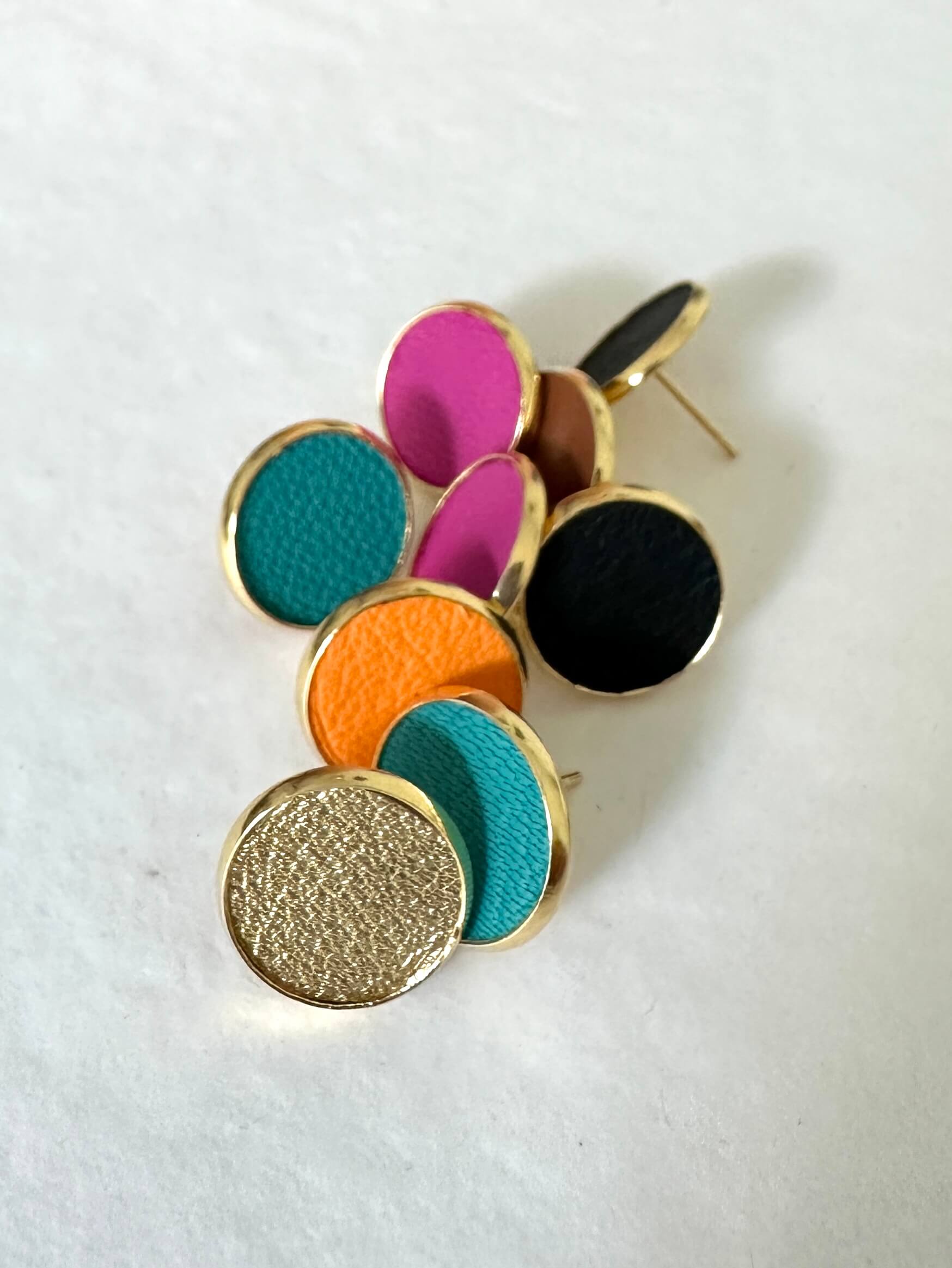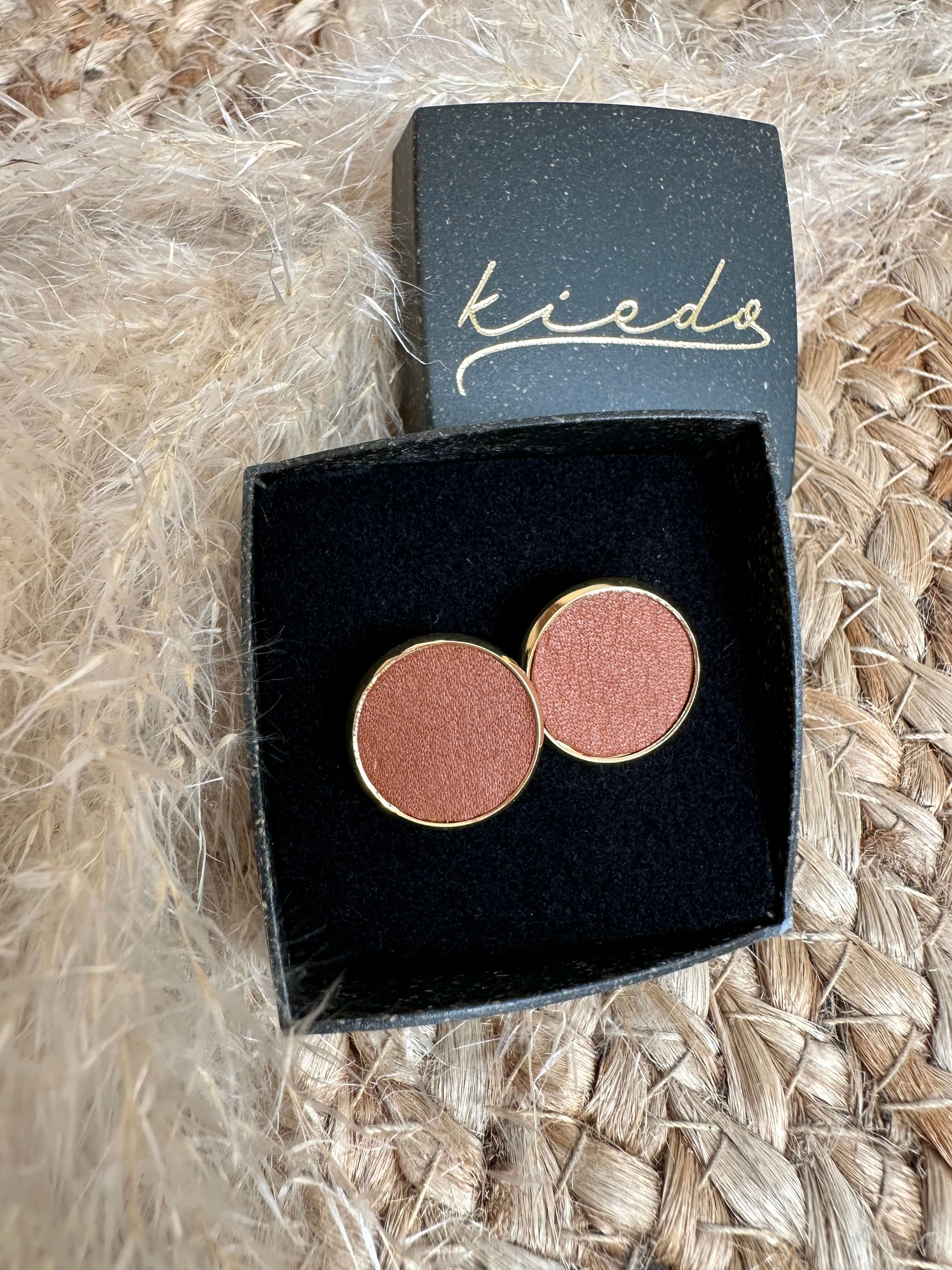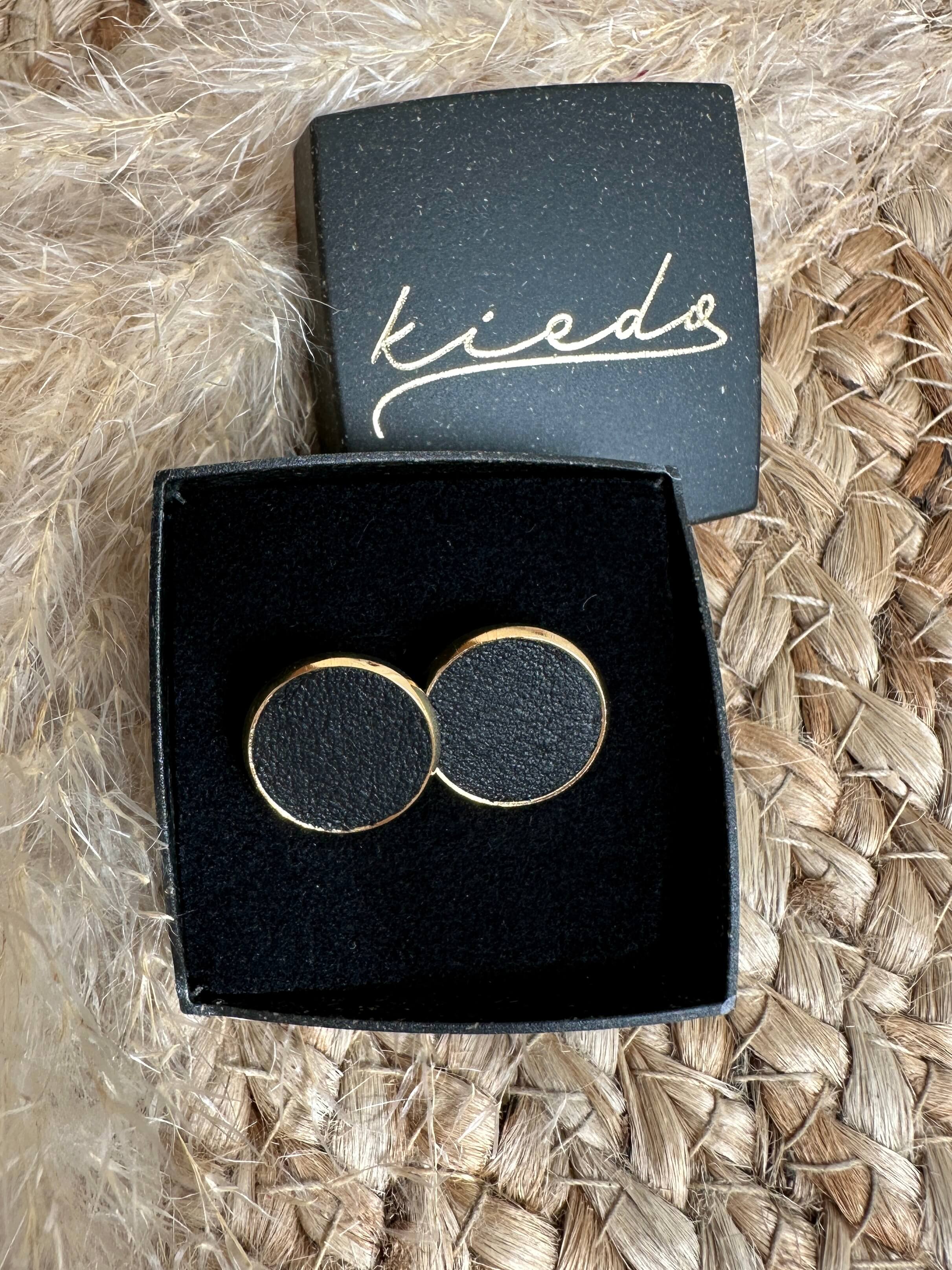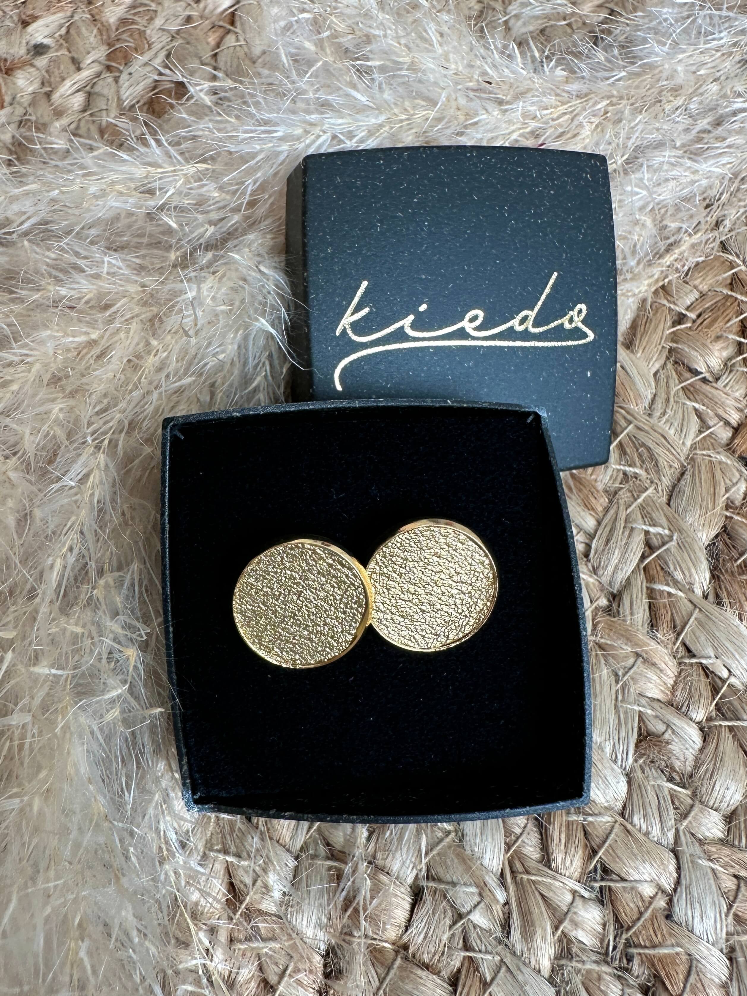 Yksinkertaista luxusta - kultaiset nappikorvikset. Napit ovat kevyet ja ne istuvat kauniisti korvissa. Korvakorujen materiaali on kietaisuvöiden valmistuksen ylijäämänahkaa, joten ne mätsäävät täydellisesti vöihin. Korvisten kultaus on aitoa 18K kultaa. Nappikorvakoru on halkaisijaltaan 14mm. Korujen suojana on ainutlaatuinen, Suomessa valmistettu biohajoava korulaatikko.